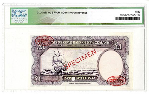 New Zealand. Specimen 1 Pound, ND (1960), P-159ds RBNZ B60s. ICG AU/UNC 60* with comment "Glue Residue from Mounting on Reverse". TDLR.