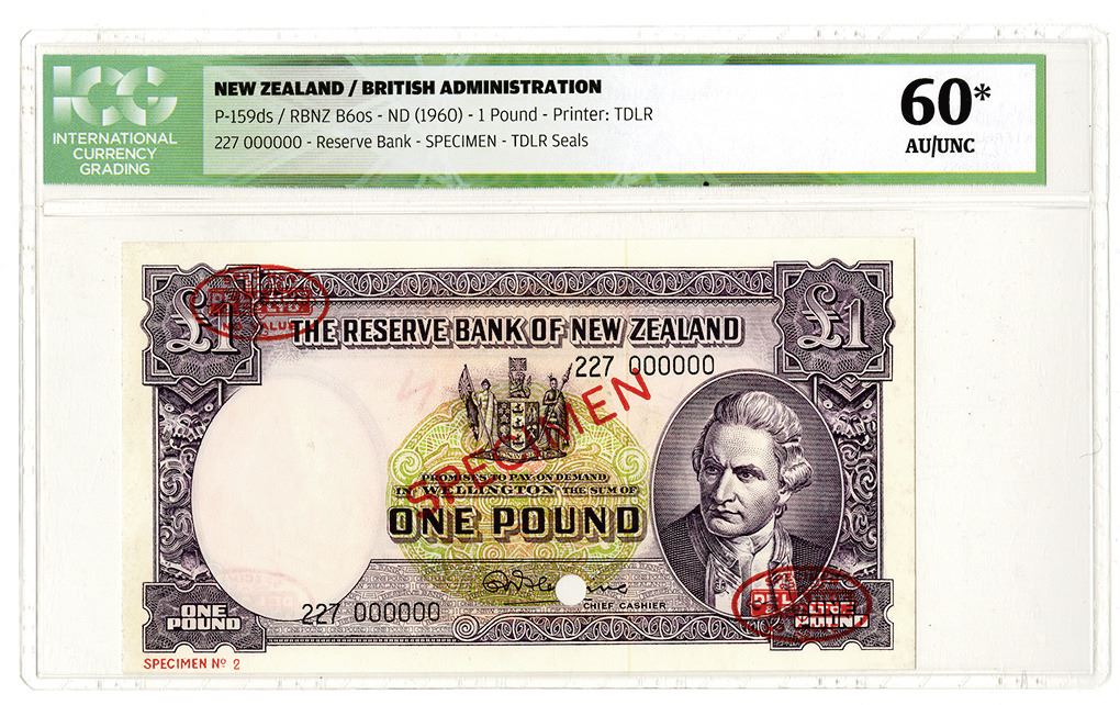 New Zealand. Specimen 1 Pound, ND (1960), P-159ds RBNZ B60s. ICG AU/UNC 60* with comment "Glue Residue from Mounting on Reverse". TDLR.