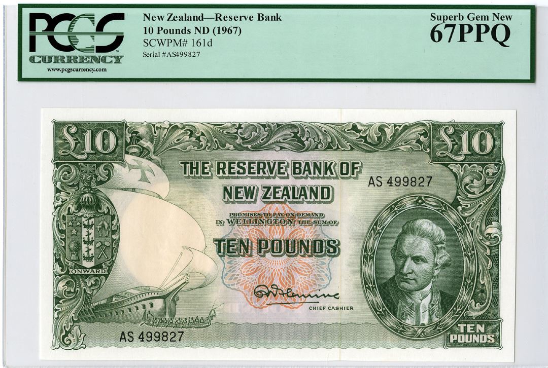 New Zealand, £10, P-161d, Issued banknote, Olive green, S/N AS 499827, PCGS graded Superb Gem Uncirculated 67 PPQ, Attractive high grade note. TDLR. This is the highest graded designation in the PMG census for this note out of 119 graded. This will be impossible to improve upon.