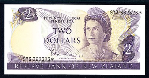 New Zealand, $2, P-164d*, Replacement Star note, S/N 9Y3 362323*, PMG graded Choice Uncirculated 64 EPQ. Hardie signature, TDLR. Only 7 graded by PMG.