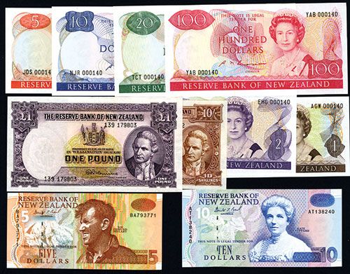 New Zealand, ND (1985-89), Lot of 6 different Banknotes, All with S.T. Russell Signatures, all ending in the numerical Serial number “000140” but all with different pre-fixes. Includes $1; $2; $5; $10; $20; and $100, P-169b to P-171b, all are in Choice to Gem Uncirculated condition (The $100 appears Gem), attractive set with matching serial numbers. BWC.