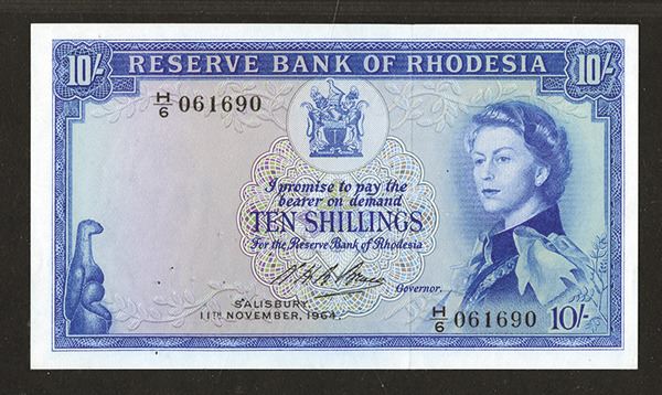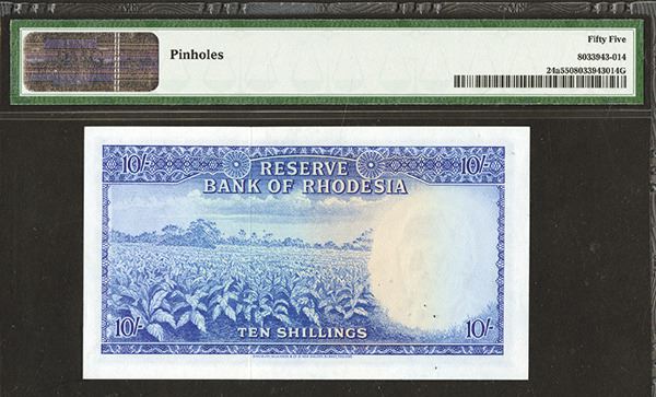 Rhodesia, 10 Shillings, P-24a, Issued banknote, Blue on m/c, Queen Elizabeth II on right, back blue, PMG graded About Uncirculated 55, scarce note in any condition and rarely seen this nice. BWC.
