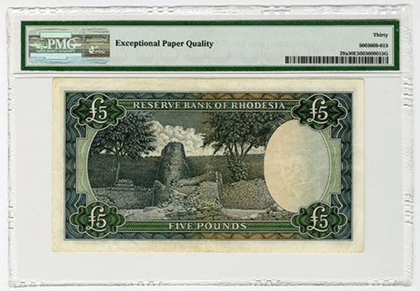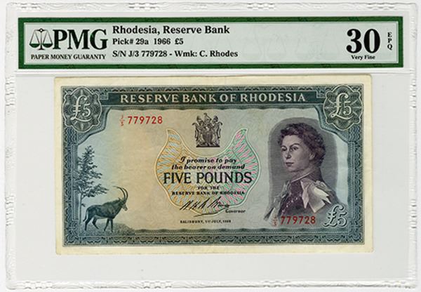 Rhodesia. Issued 5 Pounds, 1966, P-29a. PMG graded Very Fine 30 EPQ (Cert # 5003609-015).