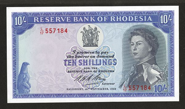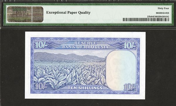 Rhodesia, 10 Shillings, P-27b, Issued banknote, Black on blue and m/c, Queen Elizabeth II on right, back blue, PMG graded Choice Uncirculated 64 EPQ.