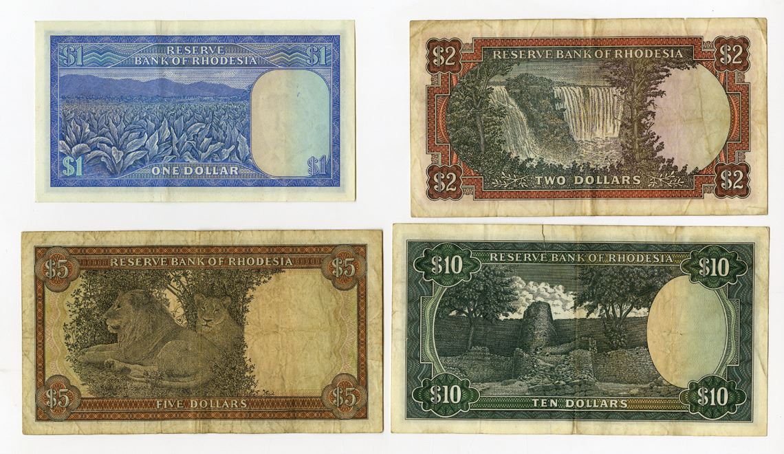Rhodesia, 1972-74. Lot of 4 Issued Banknotes, Includes: 1 Dollar, P-30h, 1973 AU; 2 Dollar, P-31g, 1974, VF; 5 Dollars, P-32a, 1972, VF; 10 Dollars (Choice VF but there is an 8 mm tear in the top right middle margin), P-33e, 1973; (4). Sold "AS IS" no returns accepted.
