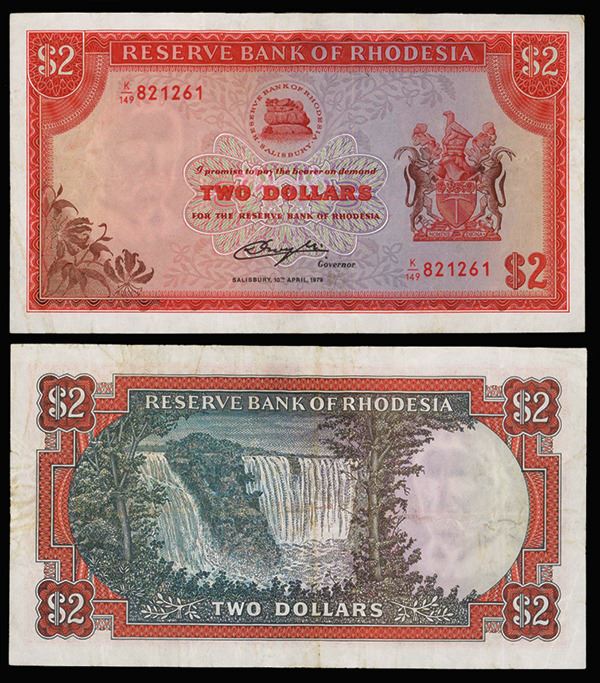 Salisbury, Rhodesia, 1979. $2, P-31c, Red on m/c, Arms on right with bank arms in middle, back red on m/c with waterfalls and trees, S/N K/149 821261. PMG graded "25 Very Fine", Attractive note from this popular series.