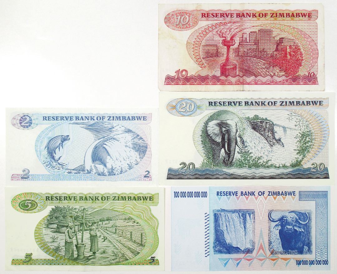 Zimbabwe... 1983-2008. $2, $5, $10, $20, $100 Trillion, P-1b; 2c; 3d; 4c; 91, issued banknote quintet, VF to Unc (5).