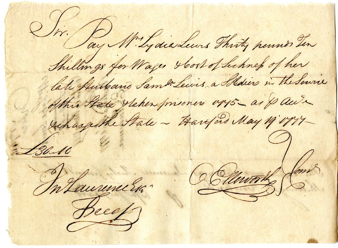 Hartford, Connecticut, 1777. Fascinating promissory note to pay Mrs. Lydia Lewis 30 Pounds, 10 Shillings for "wages & cost of sickness of her late husband Samuel Lewis, a Solider in the Service of this State & taken prisoner 1775" and to charge the state, signed by Connecticut Treasurer John Lawrence. Signed by Pay-Table member Oliver Ellsworth. Notes such as this were issued by the State of Connecticut to help finance the Revolutionary War. The Pay-Table (also known as the Committee of Four) managed Connecticut's military finances during the ongoing conflict. John Lawrence (1719-1802) served as treasurer of the Connecticut colony, and later as the Connecticut State Treasurer from 1769 to 1789. During the Revolutionary War, Lawrence was commissioner of loans for the new nation. Oliver Ellsworth (1745-1807) was an American lawyer, judge, politician, and diplomat. He was a framer of the United States Constitution, a United States Senator from Connecticut, and the third Chief Justice of the United States. In 1777, he became the state attorney for Hartford County, Connecticut and was selected as a delegate to the Continental Congress, serving during the remainder of the American Revolutionary War. He served as a state judge during the 1780s and was selected as a delegate to the 1787 Philadelphia Convention, which produced the United States Constitution. While at the convention, Ellsworth played a role in fashioning the Connecticut Compromise between the more populous states and the less populous states. He also served on the Committee of Detail, which prepared the first draft of the Constitution, but he left the convention before signing the document. His influence helped ensure that Connecticut ratified the Constitution, and he was elected as one of Connecticut's inaugural pair of Senators, serving from 1789 to 1796. He was the chief author of the Judiciary Act of 1789, which shaped the federal judiciary of the United States and established the Supreme Court's power to overturn state supreme court decisions that were contrary to the United States Constitution. Ellsworth served as a key Senate ally to Alexander Hamilton and aligned with the Federalist Party. He led the Senate passage of Hamiltonian proposals such as the Funding Act of 1790 and the Bank Bill of 1791. He also advocated in favor of the United States Bill of Rights and the Jay Treaty. In 1796, after the Senate rejected the nomination of John Rutledge to serve as Chief Justice, President George Washington nominated Ellsworth to the position. Ellsworth was unanimously confirmed by the Senate, and served until 1800, when he resigned due to poor health. He subsequently served on the Connecticut Governor's Council until his death in 1807. Great piece of Revolutionary history which includes the name of a widowed woman, scarce in this time period. VF condition.