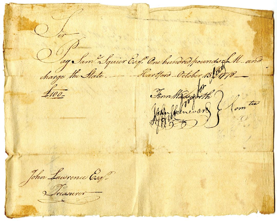 Hartford, Connecticut, 1778. Handwritten promissory note to pay Samuel Squire, Esq. the sum of 100 Pounds and "charge the State," dated October 13th, 1778. Signed by Jedediah Huntington, Pay-Table members Fenn Wadsworth and John Chenward, and Connecticut Treasurer John Lawrence, Esq. at bottom left. Promissory Notes like this were issued by the State of Connecticut to help finance the Revolutionary War. The Pay-Table (also known as the Committee of Four) managed Connecticut's military finances during the ongoing conflict. John Lawrence (1719-1802) served as treasurer of the Connecticut colony, and later as the Connecticut State Treasurer from 1769 to 1789, spanning the crucial period of colonial rule, through the American revolution, and into the early years of the United States. During the Revolutionary War, Lawrence was commissioner of loans for the new nation. Fenn Wadsworth (1750/51-1785) was a brigade major to General James Wadsworth from 1776 to 1779. He fought in many battles during that time, but his failing health forced him to leave active service. Wadsworth was involved in Connecticut's early governance, shown by his membership to the Committee of Four in this document. Jedediah (or Jedidiah) Huntington (4 August 1743 - 25 September 1818) was an American general in the Continental Army during the American Revolutionary War. After the war, he served in numerous civilian posts. Fine condition with some staining, still in good condition for its age. Interesting piece of American Revolutionary history.
