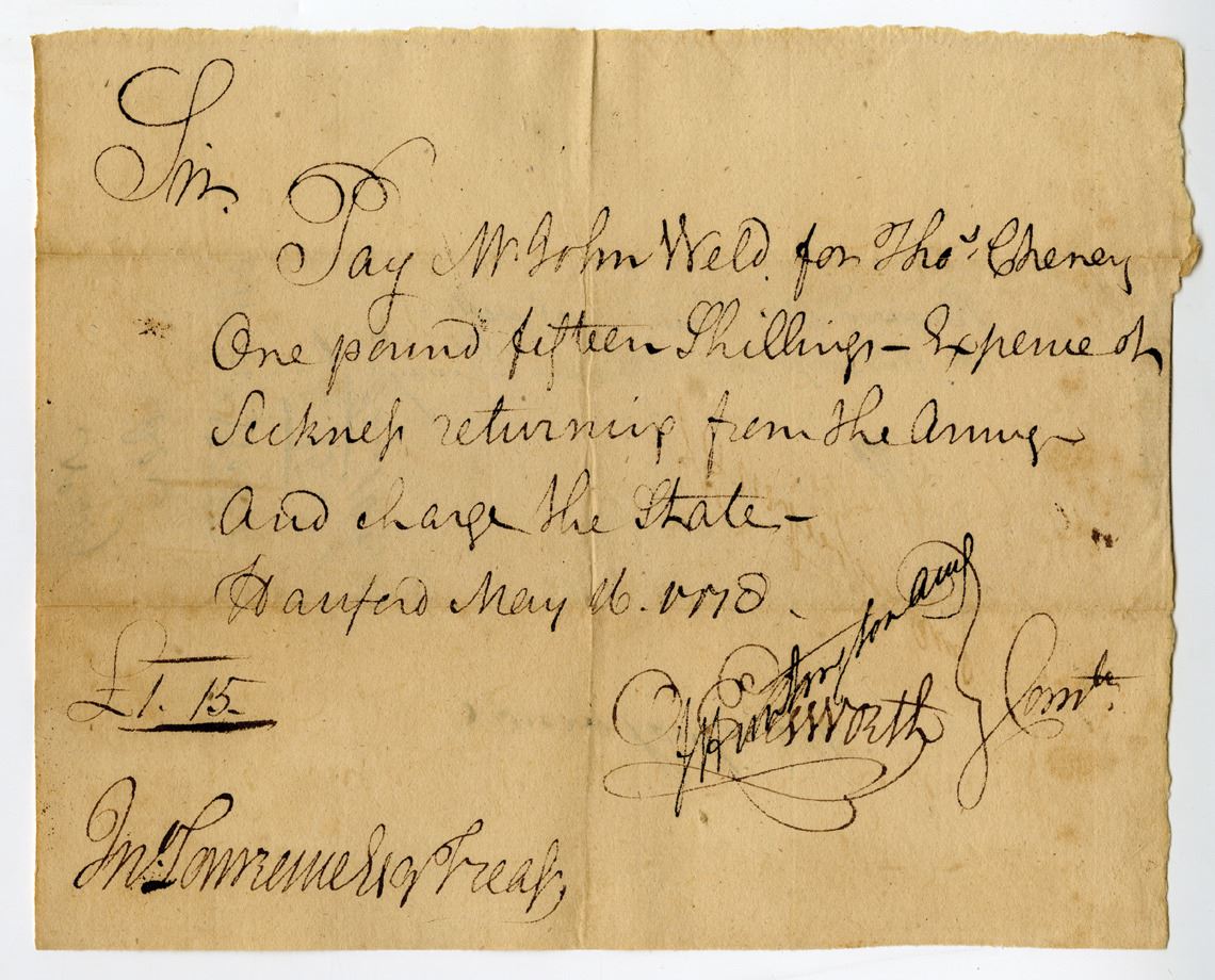 Hartford, Connecticut, May 16th, 1778. 1 Pound 15 Shillings Promissory Note signed by John Lawrence, Fenn Wadsworth, and others on the Pay Table Office. Fine to VF condition. Hartford, Connecticut, May 16th, 1778. 1 Pound 15 Shillings . Handwritten heck or draft note to pay W. John Weld for Thos. Cheney the sum of 1 Pound 15 Shillings for "expense of sickness returning from the army". Signed by Pay-Table members Oliver Ellsworth, Jedediah Huntington, and John Lawrence. Promissory Notes like this were issued by the State of Connecticut to help finance the Revolutionary War. The Pay-Table (also known as the Committee of Four) managed Connecticut's military finances during the ongoing conflict. John Lawrence (1719-1802) served as treasurer of the Connecticut colony, and later as the Connecticut State Treasurer from 1769 to 1789, spanning the crucial period of colonial rule, through the American revolution, and into the early years of the United States. During the Revolutionary War, Lawrence was commissioner of loans for the new nation. VF condition. Fascinating piece of history from the Revolutionary War.