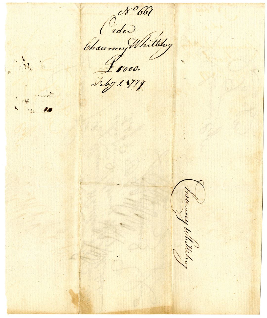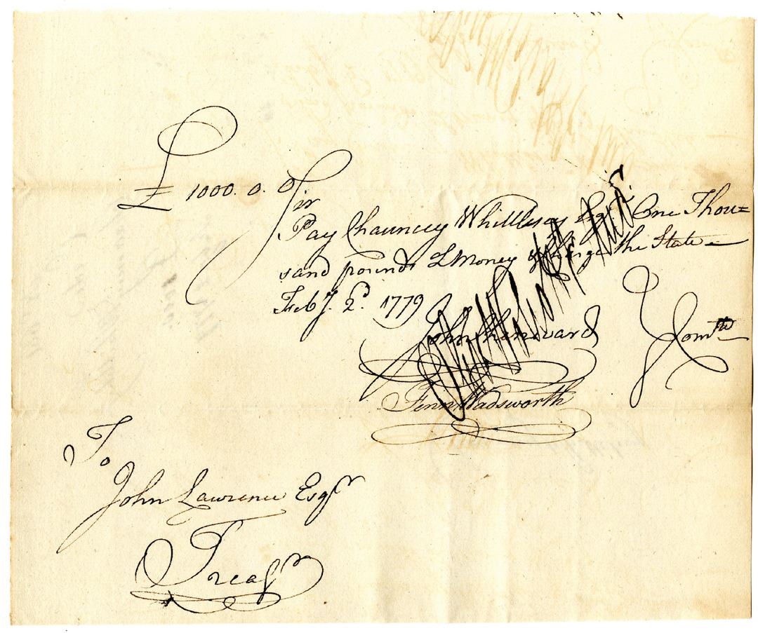 Hartford, Connecticut, 1779. Promissory note to pay Chauncey Whittelsey £1000 high denomination note and "charge the state" dated February 2nd, 1779. Signed by Oliver Wolcott Sr. (November 20, 1726 Ð December 1, 1797), he was an American politician. He was a signer of the United States Declaration of Independence and also of the Articles of Confederation as a representative of Connecticut and the nineteenth Governor of Connecticut. He was a major general for the Connecticut Militia in the Revolutionary War serving under George Washington. It is also signed by Pay-Table Committee members, John Chenward and Fenn Wadsworth, and with Connecticut Treasurer John Lawrence's name at bottom left corner. Promissory Notes like this were issued by the State of Connecticut to help finance the Revolutionary War. The Pay-Table (also known as the Committee of Four) managed Connecticut's military finances during the ongoing conflict. Chauncey Whittelsey (likely 1746-1812, but could be his father of the same name, who lived from 1717-1787 and was also active during the war) was appointed by the state to be the active purchasing clothier during the Revolutionary War. In May of 1782 Whittelsey was appointed quartermaster-general of the militia, and his name appears in many records of the time. John Lawrence (1719-1802) was the treasurer of the Connecticut colony, and later the Connecticut State Treasurer, serving in his role from 1769 to 1789. During the Revolutionary War, Lawrence was commissioner of loans for the new nation. Fenn Wadsworth (1750/51-1785) was a brigade major to General James Wadsworth from 1776 to 1779. He fought in many battles during that time, but his failing health forced him to leave active service. Wadsworth stayed in Connecticut's government, as shown by his membership to the Pay-Table Committee. Black handwriting with some toning and fold lines, in incredible VF to XF condition for its age. Fascinating piece of history from Revolutionary America.