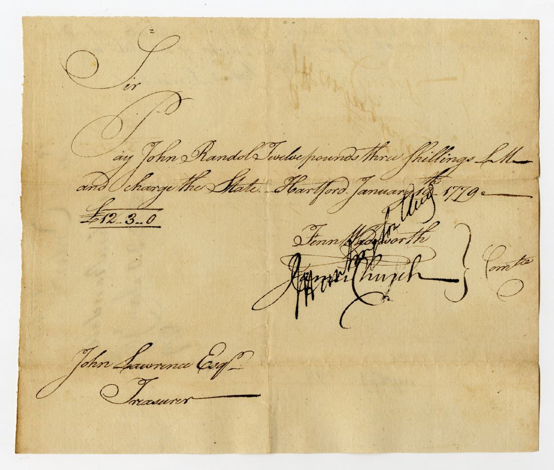 Hartford, Connecticut, January 10th, 1779. 12 Pounds 3 Shillings Promissory Note to help finance the Revolutionary War. It was payable in Connecticut Bills, The Notes is signed by Fenn Wadsworth, James Church, Jedediah Huntington, and John Lawrence. Military finances in the state of Connecticut were managed by the Pay-Table which was also known as the Committee of Four during the Revolutionary War. Fenn Wadsworth (1750/51-1785) was a brigade major to General James Wadsworth from 1776 to 1779. He fought in many battles during that time, but his failing health forced him to leave active service. John Lawrence (1719-1802) served as treasurer of the Connecticut colony, and later as the Connecticut State Treasurer from 1769 to 1789, spanning the crucial period of colonial rule, through the American revolution, and into the early years of the United States. During the Revolutionary War, Lawrence was commissioner of loans for the new nation. Oliver Wolcott Jr. (January 11, 1760 - June 1, 1833) was the second United States Secretary of the Treasury, a judge of the United States Circuit Court for the Second Circuit, and the 24th Governor of Connecticut. He was a member of the Pay-Table Committee for several years, and was a commissioner to settle claims of Connecticut against the United States from 1784 to 1788. When Wolcott died in 1833 in New York City, he was the last surviving cabinet member of the Washington administration. VF condition. Interesting certificate of Revolutionary Connecticut history with signatures from leading figures of the time.