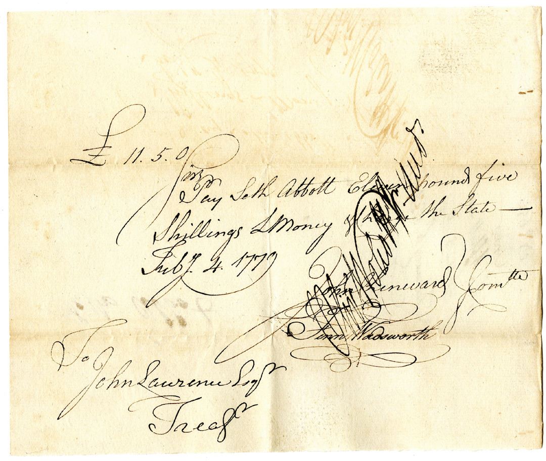 Connecticut, 1779. Handwritten promissory note to pay Seth Abbott the sum of 11 Pounds and 5 Shillings of lawful money, and "charge the State," dated February 4th, 1779. Signed by Pay-Table members John Chenward and Fenn Wadsworth, with Oliver Wolcott Jr's distinctive signature across, as well as signed by Treasurer John Lawrence. Promissory Notes like this were issued by the State of Connecticut to help finance the Revolutionary War. The Pay-Table (also known as the Committee of Four) managed Connecticut's military finances during the ongoing conflict. Seth Abbott may have fought in the Revolutionary War. Fenn Wadsworth (1750/51-1785) was a brigade major to General James Wadsworth from 1776 to 1779. He fought in many battles during that time, but his failing health forced him to leave active service. Wadsworth stayed in Connecticut's government, as shown by his membership to the Pay-Table Committee. Oliver Wolcott Jr. (January 11, 1760 - June 1, 1833) was the second United States Secretary of the Treasury, a judge of the United States Circuit Court for the Second Circuit, and the 24th Governor of Connecticut. He was a member of the Pay-Table Committee for several years, and was a commissioner to settle claims of Connecticut against the United States from 1784 to 1788. In 1796, he was George and Martha Washington's intermediary in getting the Collector of Customs for Portsmouth, New Hampshire, Joseph Whipple, to capture and send an escaped slave, Oney (sometimes Ona) Judge, back to Mount Vernon. He was ultimately unsuccessful. When Wolcott died in 1833 in New York City, he was the last surviving cabinet member of the Washington administration. John Lawrence (1719-1802) served as treasurer of the Connecticut colony, and later as the Connecticut State Treasurer from 1769 to 1789, spanning the crucial period of colonial rule, through the American revolution, and into the early years of the United States. During the Revolutionary War, Lawrence was commissioner of loans for the new nation. VF condition with interesting watermark on paper.