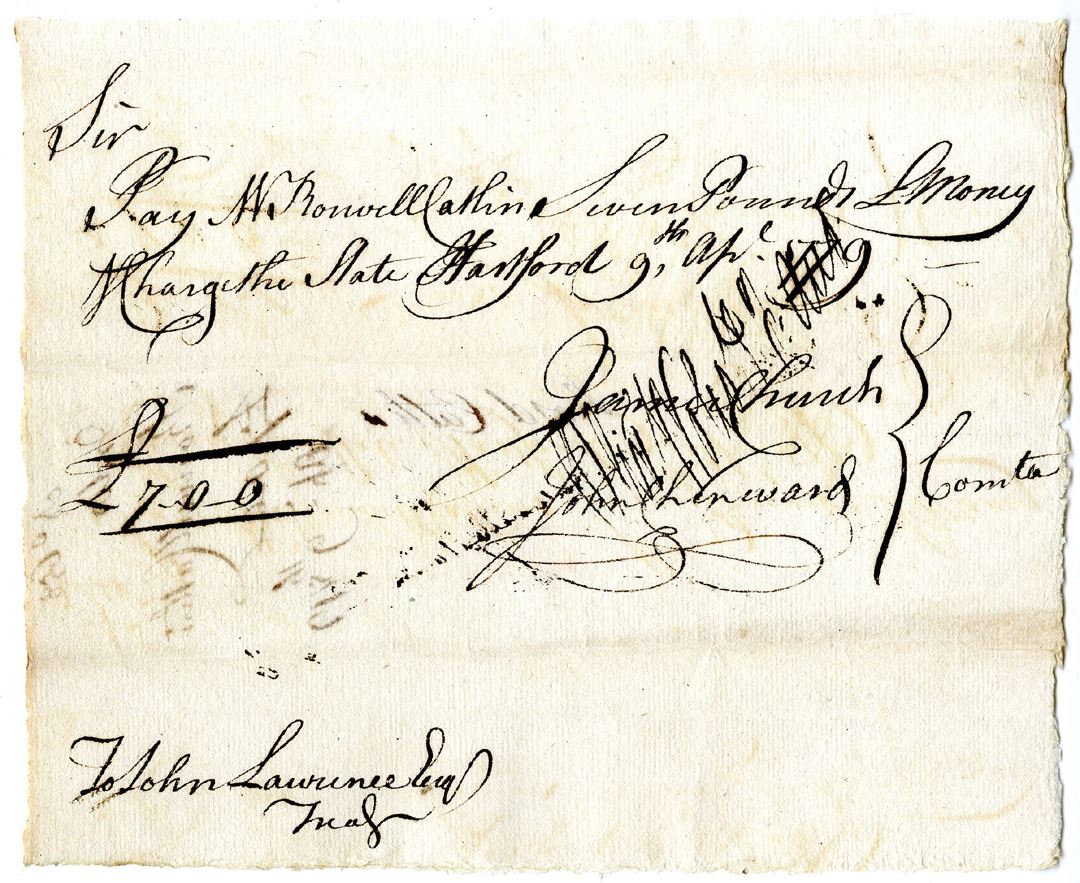 Hartford, Connecticut, 1779. Handwritten promissory note to pay 7 Pounds of lawful money and "charge the state," dated April 9th, 1779. Signed by Pay-Table members James Church and John Chenward with Oliver Wolcott Jr's distinctive signature across. Also signed by Connecticut Treasurer John Lawrence at bottom left. Promissory Notes like this were issued by the State of Connecticut to help finance the Revolutionary War. The Pay-Table (also known as the Committee of Four) managed Connecticut's military finances during the ongoing conflict. John Chenward (1733-1805) was a Captain in the army and his signature appears on many documents from this period. Oliver Wolcott Jr. (January 11, 1760 - June 1, 1833) was the second United States Secretary of the Treasury, a judge of the United States Circuit Court for the Second Circuit, and the 24th Governor of Connecticut. He was a member of the Pay-Table Committee for several years, and was a commissioner to settle claims of Connecticut against the United States from 1784 to 1788. In 1796, he was George and Martha Washington's intermediary in getting the Collector of Customs for Portsmouth, New Hampshire, Joseph Whipple, to capture and send an escaped slave, Oney (sometimes Ona) Judge, back to Mount Vernon. He was ultimately unsuccessful. When Wolcott died in 1833 in New York City, he was the last surviving cabinet member of the Washington administration. John Lawrence (1719-1802) served as treasurer of the Connecticut colony, and later as the Connecticut State Treasurer from 1769 to 1789, spanning the crucial period of colonial rule, through the American revolution, and into the early years of the United States. During the Revolutionary War, Lawrence was commissioner of loans for the new nation. Fine-VF condition.