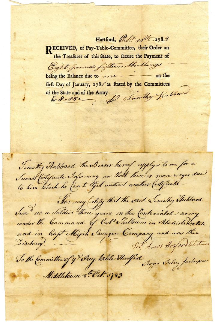Hartford, Connecticut, 1783. Lot of 2 items, a Promissory Note and matching Certificate, both relaying payments owed to Timothy Hubbard, who served as a soldier for "three years in the Continental Army, under the command of Colonel Sherburne in Rhode Island and in Captain Abijah Savage's Company and was then discharged." One note is mostly type-set in black, with some black handwriting, issued October 10th, 1783 for the total of 8 Pounds, 15 Shillings, Fine-VF condition. Second note is entirely handwritten in black, certifying that Hubbard is owed money from the Pay Table for his service, no amount provided, Fine condition with some staining. Promissory Notes like this were issued by the State of Connecticut to help to finance the Revolutionary War. The Pay-Table (also known as the Committee of Four) managed Connecticut's military finances during the ongoing conflict. Colonel Henry Sherburne (1748 - 1824) was an officer in the Continental Army during the American Revolution. He commanded Sherburne's Additional Continental Regiment from 1777 to 1781 and served as the General Treasurer of Rhode Island from 1792 to 1807. Abijah Savage (1744 - 1825) joined the militia surrounding Boston on May 1st, 1775. He was captured in Spencer's Regiment for Quebec Expedition in December of 1775, and was a prisoner until January 1777, when he was released in a prisoner exchange. In March, he was appointed a Captain in Colonel SherburneÕs Regiment of the Continental Army. Eight letters from Captain Savage, all written during the war, are found in George WashingtonÕs papers. Following the war, Abijah was an original member of the Society of the Cincinnati. In 1792, he received land on the Hocking River in Athens County, Ohio, in payment for his service. Rare pair of items related to military history during the American Revolution. (2)
