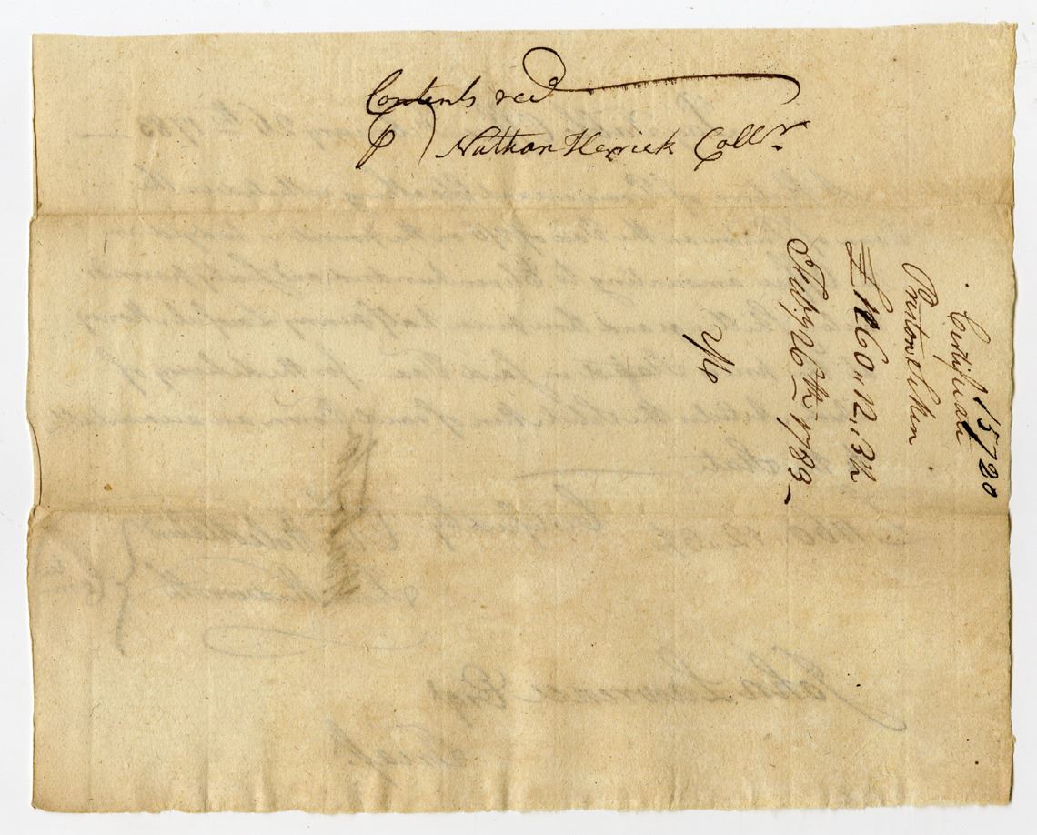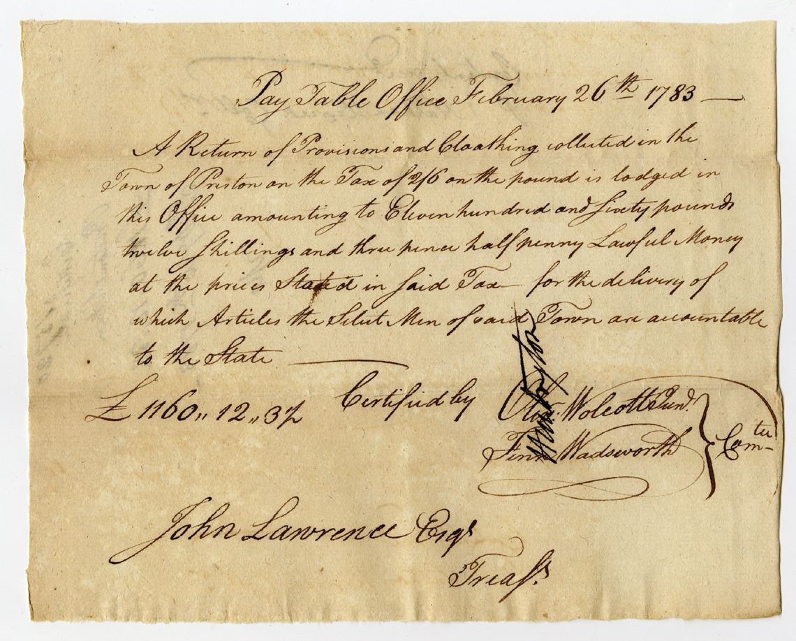 Pay Table Office, Connecticut, February 26th, 1783. A letter-receipt referring to "return of provisions and clothing collected in the town of Prinston on the Tax of 2/6 on the Pound is lodged in the office amounting to 1160 pounds 12 shillings and 3 Pence half penny Lawful Money at the prices stated in Said Tax - for delivery of which Articles the Select Men of Said Town are accountable to the state", certified by Olive Wolcott Jr., Fenn Wadsworth, Huntington, and John Lawrence. VF to XF condition. Signed by Pay-Table members Jedediah Huntington, Fenn Wadsworth, and John Lawrence. Promissory Notes like this were issued by the State of Connecticut to help finance the Revolutionary War. The Pay-Table (also known as the Committee of Four) managed Connecticut's military finances during the ongoing conflict. John Lawrence (1719-1802) served as treasurer of the Connecticut colony, and later as the Connecticut State Treasurer from 1769 to 1789, spanning the crucial period of colonial rule, through the American revolution, and into the early years of the United States. During the Revolutionary War, Lawrence was commissioner of loans for the new nation. VF condition. Fascinating piece of history from the Revolutionary War.