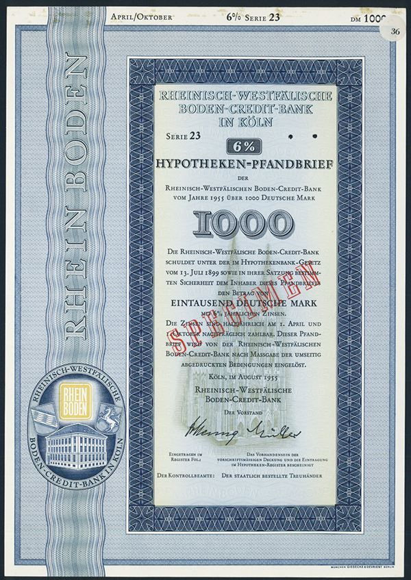 Germany, 1955, 1000 Deutschmark, 6% Specimen Bond, Black on blue border and underprint, Cathedral underprint center with bank building on lower left margin, VF-XF condition, Giesecke & Devrient.