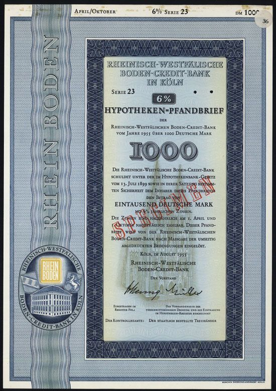 Germany, 1955, 1000 Deutschmark, 6% Specimen Bond, Black on blue border and underprint, Cathedral underprint center with bank building on lower left margin, VF-XF condition, Giesecke & Devrient.