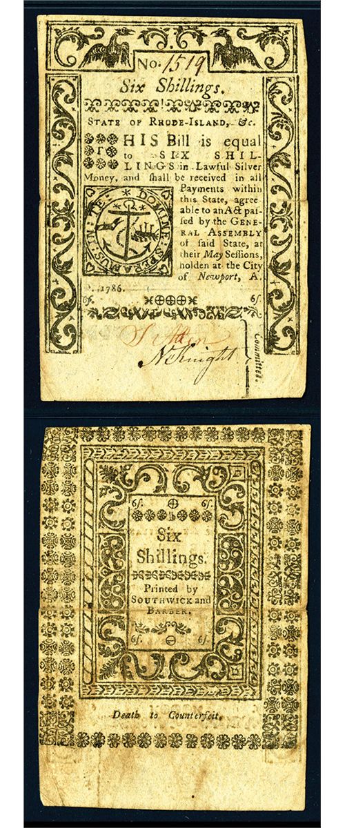 Newport, Rhode Island, May 1786, 6 Shillings, Fr#RI-296, May 1786, Issued banknote, S/N 1519, PMG graded about Uncirculated 50 NET with notation of small split at the horizontal fold. Attractive note with large margins.