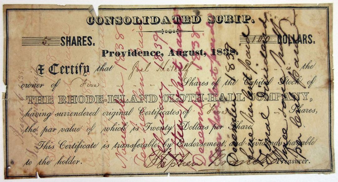 Rhode-Island Cloth-Hall Co. 1838 I/U Stock Certificate Scrip
