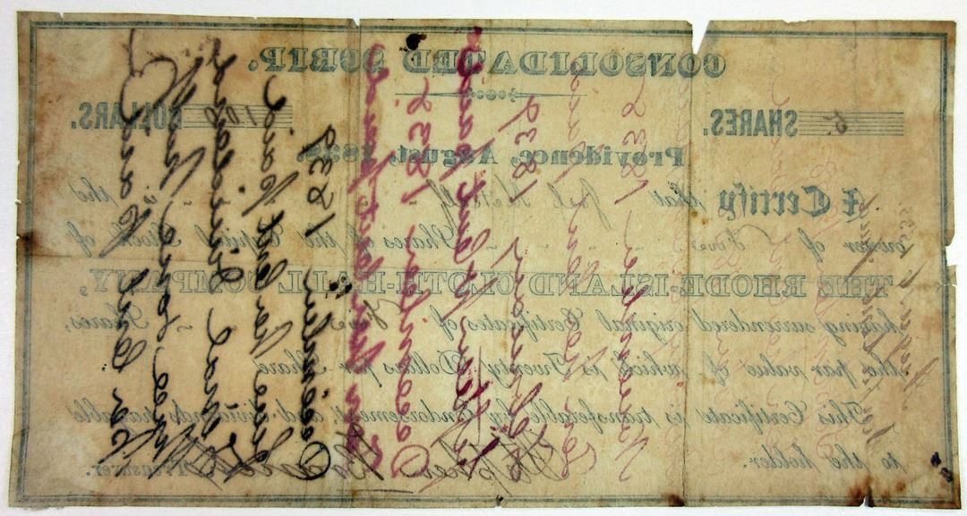 Rhode Island, 1838. 5 Shares I/C Capital Stock Certificate Consolidated Scrip, Black text with thin black border, Cancelled in ink. Fine condition with some damage to margins, archival reinforcement in a couple of small areas and slight staining. The Rhode Island Cloth-Hall Company was incorporated in 1836 in an effort to sell Rhode Island produced goods in Providence at an exhibition "Cloth Hall" rather than having them shipped to New York, Baltimore, and Philadelphia to be sold on commission by other merchants. The company was short lived, and lasted only a few years.