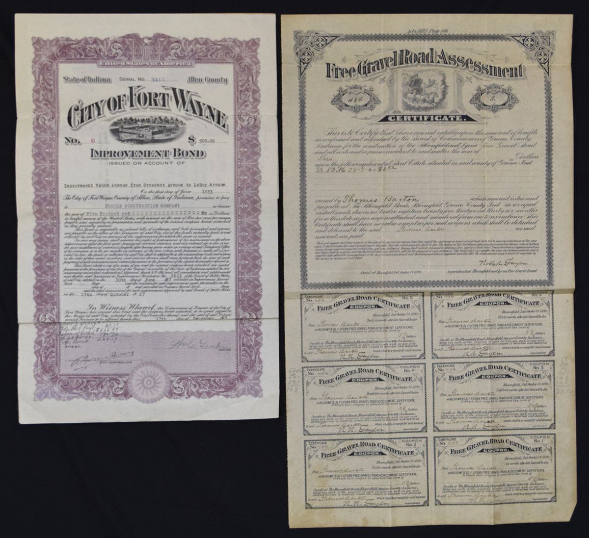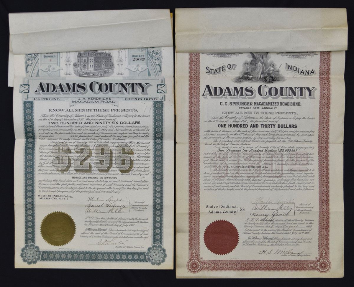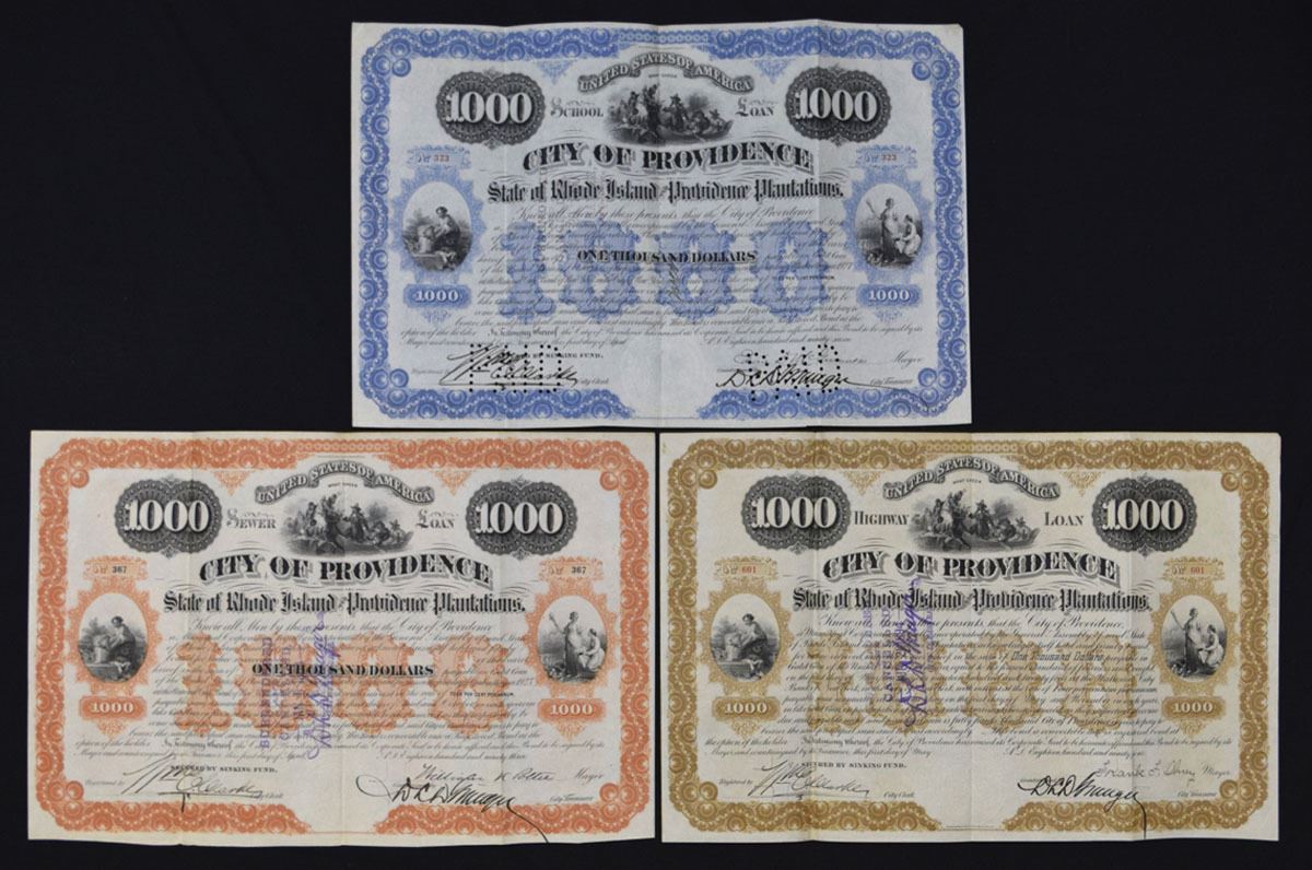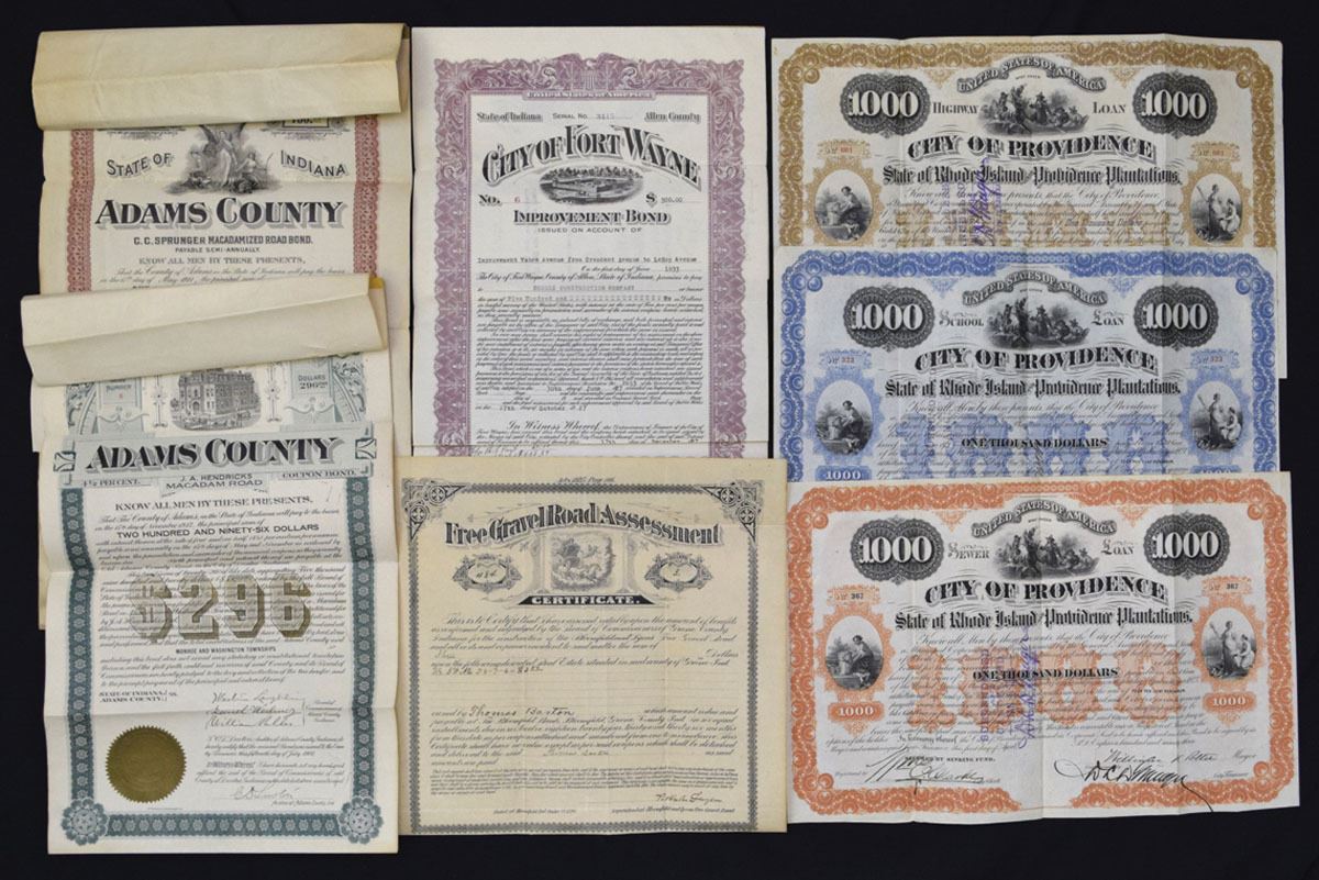 Rhode Island & Indiana, 1893-1927. Lot of 7 Municipal Bonds and Assessment Certificates representing city and county public finance, civic projects, and road improvement issues. Includes City of Providence municipal bonds in multiple colors and denominations (3); City of Fort Wayne improvement bond; Free Gravel Road Assessment certificate with attached coupons; and Adams County road bonds in different formats (2). Designs feature allegorical figures, civic seals, classical vignettes, and ornate borders. Conditions range from VF to XF overall, with fold lines and minor handling. (7). Sold “AS IS” no returns accepted.