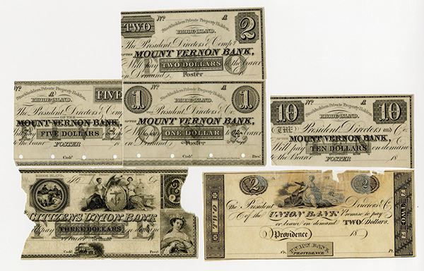 Rhode Island. Lot of 6 proof banknotes or portions of proof banknotes. The almost intact note, Providence, Union Bank, $2, repaired on top and reinforced; Foster, Mount Vernon Bank, $1; $2; $5; $10 proof middle portions of notes with ends cut off; and Scituate, Citizens Union Bank, 3/4ths of a note, missing top right corner and left 1/4 of note, possibly some very rare or scarce. RWH; Terry, Pelton & Co.; and others, Mostly Fine with missing pieces.