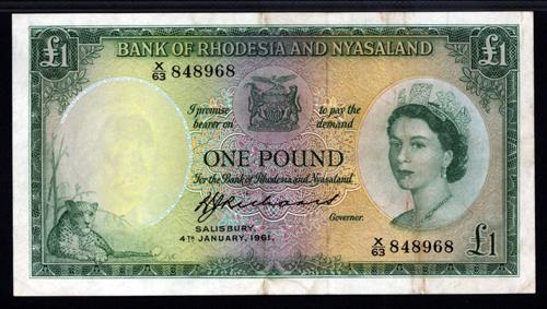 Rhodesia & Nyasaland, 4th, January 1961, 1 Pound, P-21b, Issued banknote, Richards signature, green on m/c with Queen Elizabeth on right, back green and m/c, PMG graded "35 Choice Very Fine", at first glance, the note appears XF with large margins, great colors and no distracting marks and is only one very light fold for true XF. Attractive note for the grade. BWC.