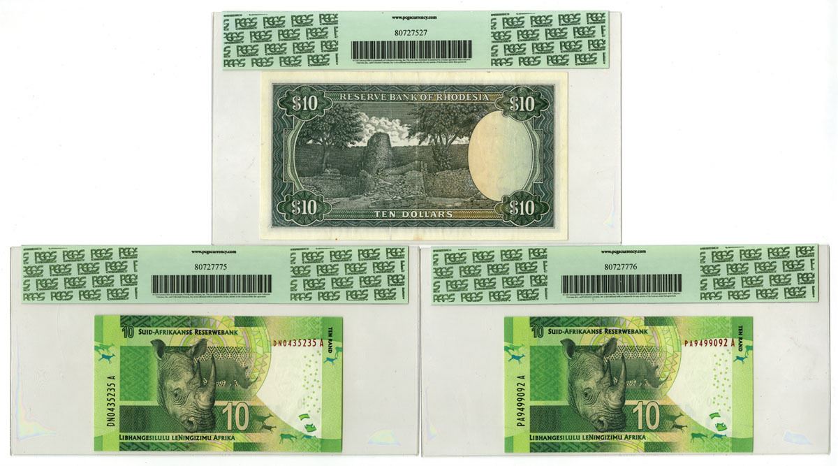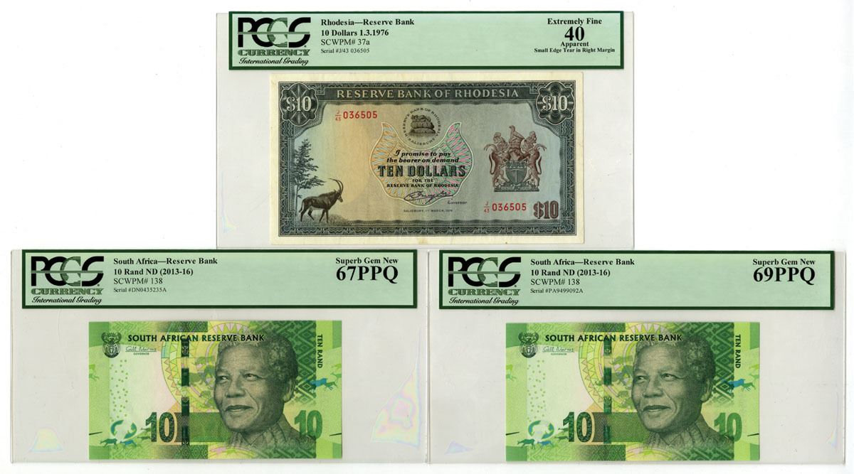 Rhodesia & South Africa, 1976-ND (1913-16). Lot of 3 Issued Banknotes, Includes: 1976, Reserve Bank of Rhodesia, 10 Dollars, P-37a, PCGS Extremely Fine 40 Apparent with note "Small Edge Tear in Right Margin"; ND (2013-16), South Africa Reserve Bank, 10 Rand, P-138 (2), PCGS graded Superb Gem New 67PPQ & Superb Gem New 69PPQ. (3). Sold "AS IS" no returns accepted.