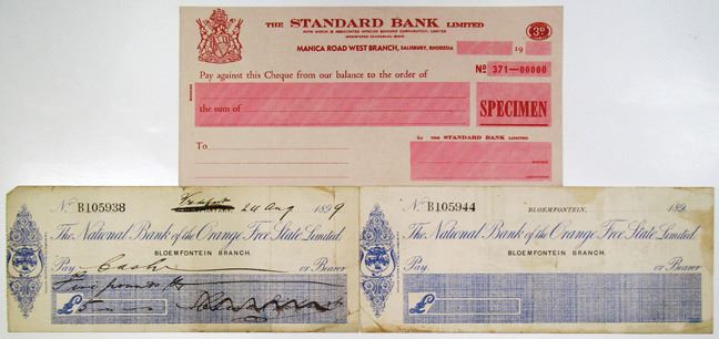 Rhodesia and South Africa. Lot of 3 pieces, Includes 2 from the Bloemfontein Branch, National Bank of the Orange Free State Limited, one is U/U with the second an I/C/ 1899 Check from another location; and, a ca. 1940-50's Standard Bank Limited Specimen Check. VF condition. (3)