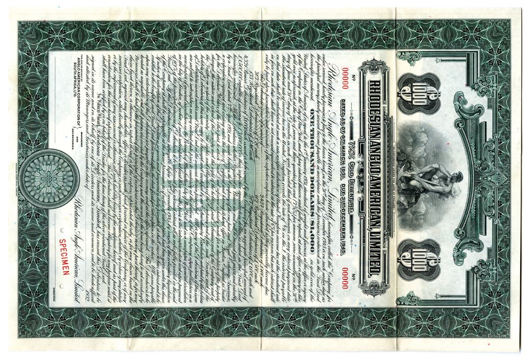 Rhodesia & England, 1932. $1000 Specimen 7 3/4% Gold Debenture Bond, Black text with green border and undertint, Allegorical man seated on rock with a pick at top center. Red specimen overprints, 00000 serial numbers, POCs. VF condition, ABNC. Also known as Rhoanglo, this company was formed in December 1928, and was a financing company for African mining endeavors.