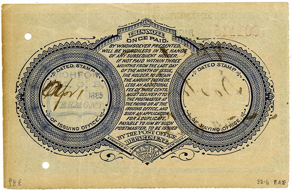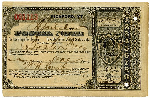 Richford, VT. 1 Cent, I/U U.S. Postal Note, Issued by the Postmaster and payable in Boston, MA. Black on beige paper with printed 3 Cents revenue stamp at right with the denomination hole punched. The back is printed in blue with April 1, 1885 dated on the back, Choice VF to XF condition with toning on the right margin. S/N 001113. Printed by Homer Lee Bank Note Company.