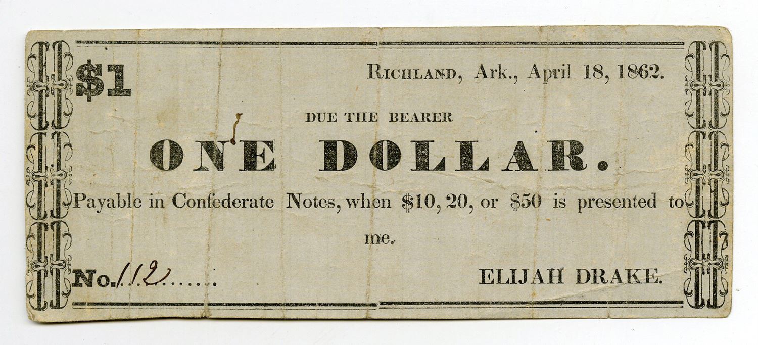 Richland, Madison County, Arkansas. 1862, Elijah Drake. $1, Unlisted scrip note location in Rothert, but listed issuer, Elijah Drake from the same county but from Wesley, Issued obsolete scrip note, Dated April 18th, 1862, Black text "Payable in Confederate Notes when $10, 20 or $50 is presented to me." with black border, Signature on back, S/N 112, Choice Fine-VF condition with toning along fold lines and aging. Very possibly unique. This is the first time this note has appeared at auction.