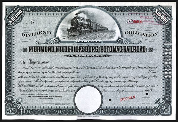 Richmond, VA. 19xx (ca.1900-1920). Certificate for Less Than $10,000. Slate-blue border and undertint. Locomotive #969, R-L. Red specimen overprints and POC's. Unlisted railroad in Cox.