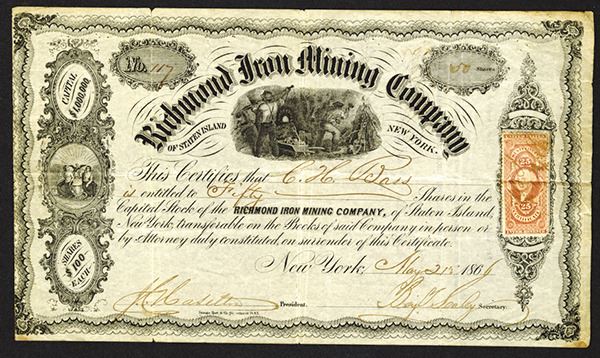 Staten Island, NY. 50 Shares, I/U stock certificate, Miners working under arched title, NY arms at left, Revenue on right, S/N 117, Fine condition small pin holes, toned paper.