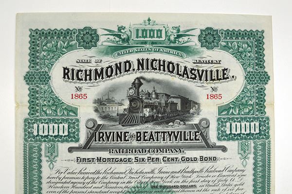 Kentucky, 1889, $1,000. Issued and uncancelled, 6% first mortgage gold bond. Green border and underprint, with train on top and man harvesting grain on bottom. FBNC, with coupons, EF, scarce and attractive bond.