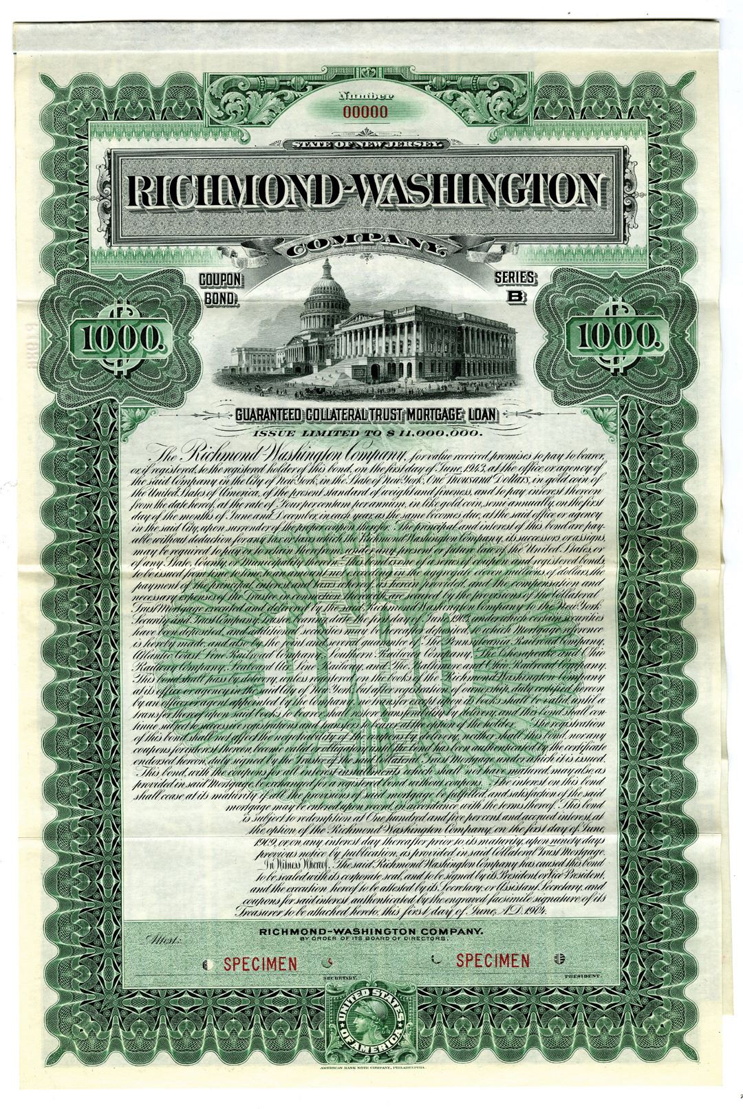 New Jersey. $1000 Specimen Series B, 4% Guaranteed Collateral Trust Mortgage Loan Coupon Bond, Black print on ornate green border and under tint, Capital Building at top, Specimen overprints, POC's, VF-XF condition. ABNC. Listed Railroad on Cox, Unlisted Bond Type.