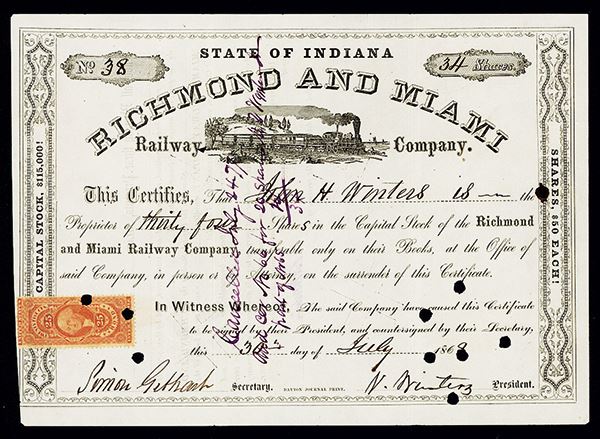Indiana, 1868, 34 shares, issued and punch and ink cancelled, Cert.#38, Locomotive past hill with house L-R under arched title, revenue stamp on left, VF condition, attractive and rare railroad stock certificate.