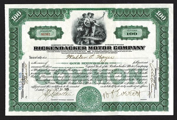 Michigan, 1926, 100 Shares, Issued and uncancelled, Black with green border, Allegorical figures with winged wheel, gears and tools, XF condition, ABNC. Signed by Barney Everitt as President. Edward Vernon Rickenbacker was an American fighter ace in World War I and Medal of Honor recipient. The Rickenbacker Motor Company was incorporated in July of 1921 when Barney Everitt decided to start up another car company. He asked Eddie Rickenbacker for the use of his name on the automobiles and named Eddie vice-president & director of sales for the company. Scarce and popular automobile certificate.