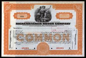 Michigan, 19xx (ca.1920's), Less than 100 shares. Orange border with 3 allegorical figures. ABNCo. Specimen, XF. Scarce and popular automobile with well known founder and famous WW I flying Ace, Eddie Rickenbacker. The company manufactured stylish, mid-priced cars, but was not successful and closed in 1927. Its demise was due, in part, to the introduction of four-wheel brakes which were rejected by the industry for marketing reasons. The next year he bought a controlling interest in the Indianapolis Speedway, which he retained until 1945.