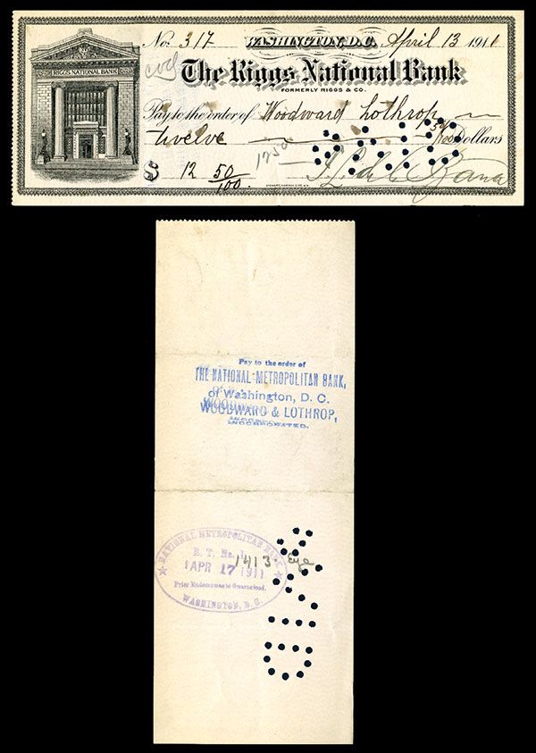 Mexico, check for $12.50, dated 13.4.1911, unlisted in Pick. Shows signature of past Mexican President De la Bar'ra. Vertical folds and punch cancels. XF and unusual.