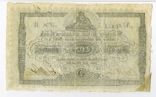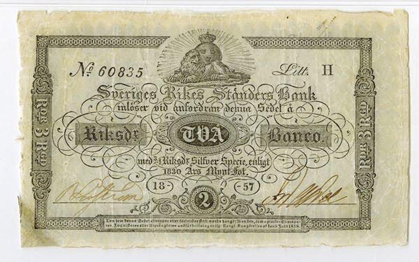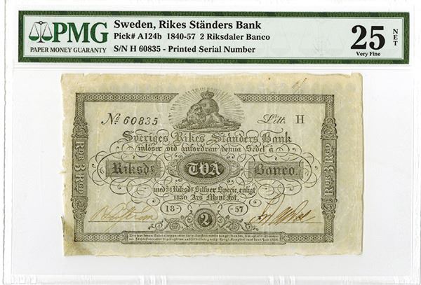 Sweden, 2 Riksdaler, P-A124b, Issued, Printed Serial Numbers, Arms at top, S/N H 60835, PMG graded Very Fine 25 NET. Scarce note.