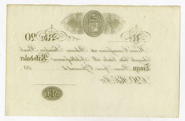 Sweden, 183x, 20 Riksdaler, Remainder banknote, arms at top, printed on watermarked thin paper, "MvT" letters in oval on bottom with watermark "M.v.Torne - Rdr20", Choice AU to Uncirculated, No serial number. Scarce early Swedish note.