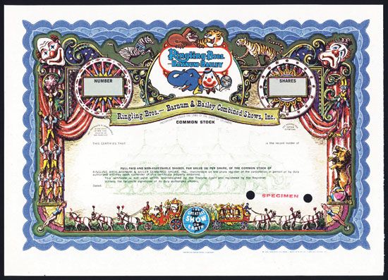 Delaware, 1969, Specimen Shares, Black on blue border and underprint, Border contains numerous circus acts, clowns, animals, etc. Ringling Bros. slogan ÒThe Greatest Show on EarthÓ bottom center, Very colorful and fun certificate, POC's, VF-XF condition, ABNC.
