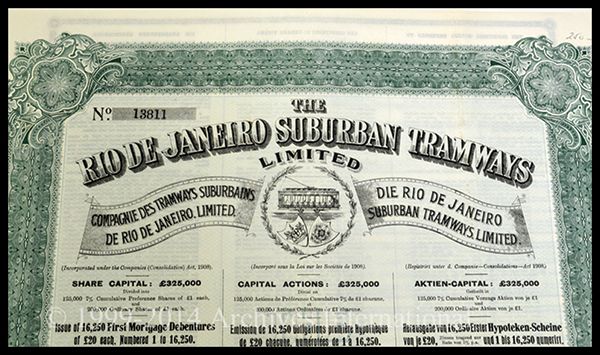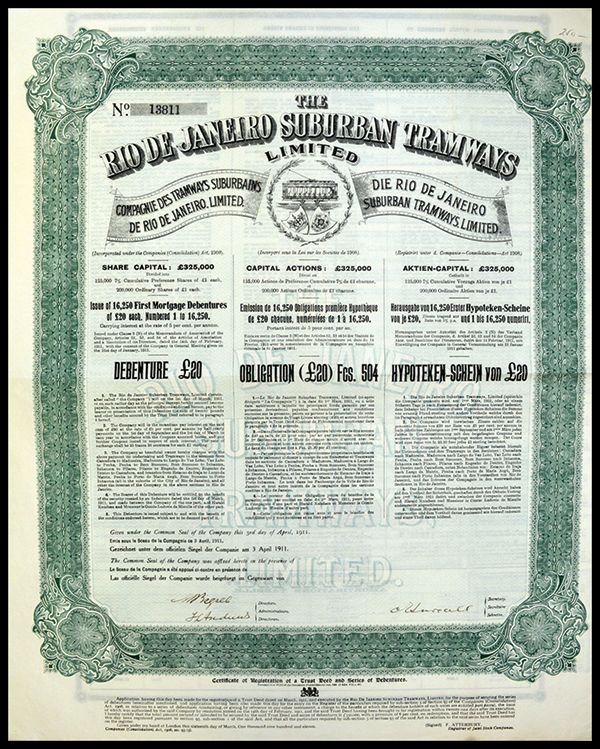 Rio De Janiero Suburban Tramways, 1911. Brazil, 20 Pounds Debenture, electric street car, green frame, issued uncancelled bond, EF.