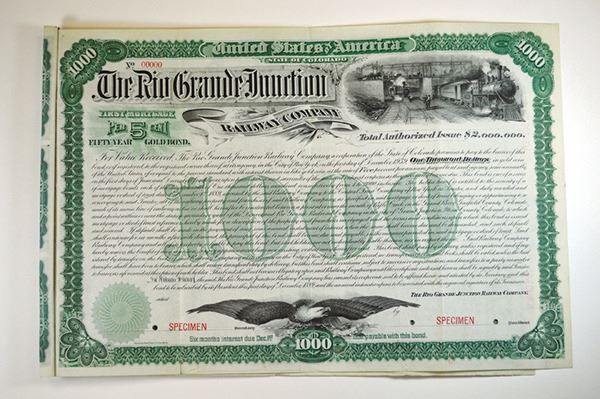Colorado. Specimen $1000 1st Mortgage 5% Fifty Year Gold Coupon Bond, Horizontal Format, Black on green border and undertint. Trains under bridge passing workers on top right with large spread winged screaming eagle at bottom. XF condition. ABNC. Unlisted as a bond in Cox and this is the only one found. Stunning design and colors would make this the center piece of any advance Colorado or railroad collection.