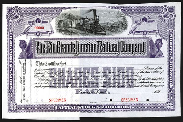 Denver, CO. 189x, Odd Shares, Capital Stock $2,000,000, Specimen, Black on brown border and under print, Locomotive L-R leaving tunnel, VF to XF condition, Attractive and rare as a specimen.