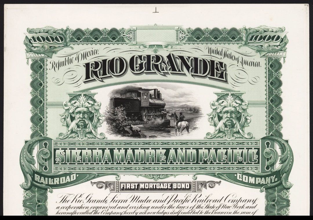 Mexico, 1897, Vertical $1000 1st Mortgage Proof bond, green border, Locomotive over small stream passing man on horse flanked by 2 ornate artistic means heads. Printed on india paper on large card, Uncancelled, Appears VF to XF but there is a small tear in the middle bottom margin that could easily be repaired and is difficult to see. International BNC. Rare Mexican bond.