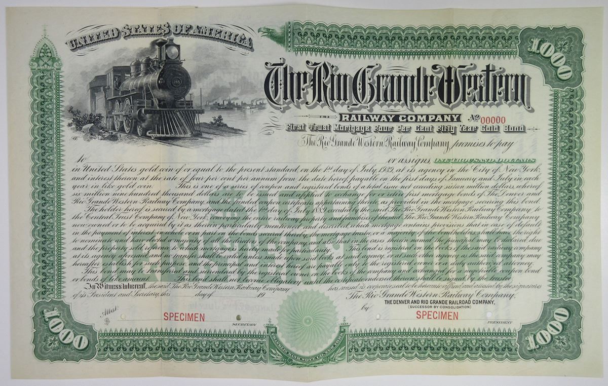 Colorado & Utah. $1000 Specimen 4% Registered First Trust Mortgage Gold Bond, Black text with green border and underprint, Train approaching at top left corner. Red specimen overprints, 00000 serial numbers, POCs. Fine condition, FBN. Rare in specimen format in Cox and not previously seen or available for photographs.
