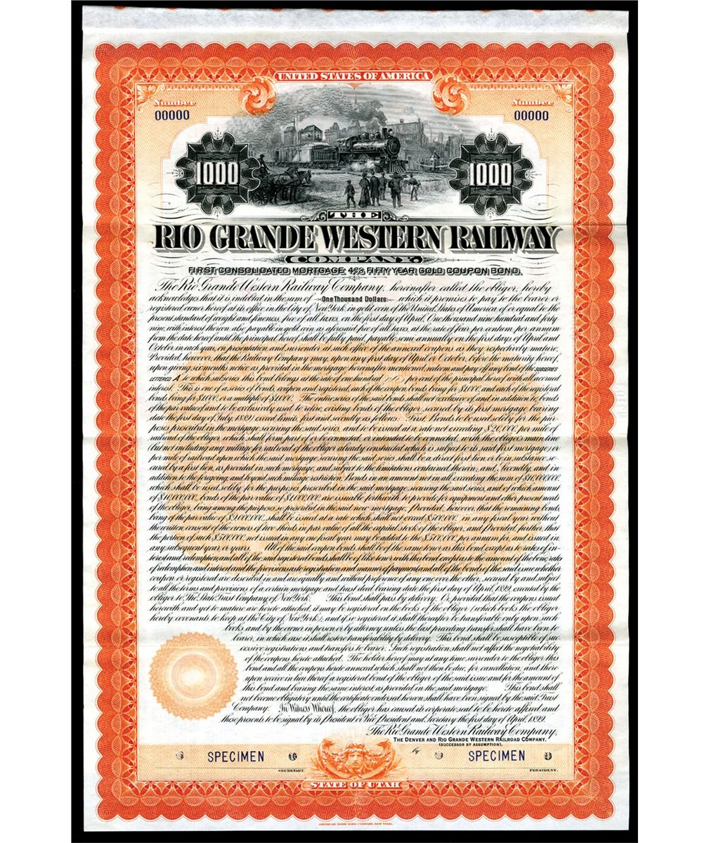 Colorado. Utah. $1000. 1st Consolidated Mortgage 4% 50 Year Gold Coupon Bond, Orange border and undertint locomotive with people watching and horse drawn wagon. Coupons attached. XF condition. POC's. ABNC. Unlisted bond variety in Cox. This railroad is only known as Specimens or proofs, no issued examples known.